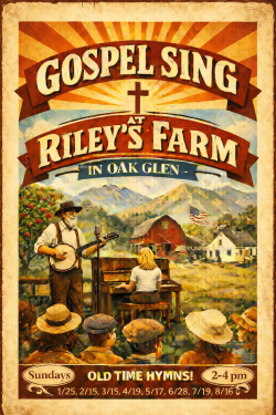Join us January 25, February 15, March 15, April 19, May 17, June 28, July 19, and August 16 from 2-4 PM in the Hawk’s Head Tavern at Riley’s Farm for congregational singing of the old time hymns, (maybe even a few psalms).