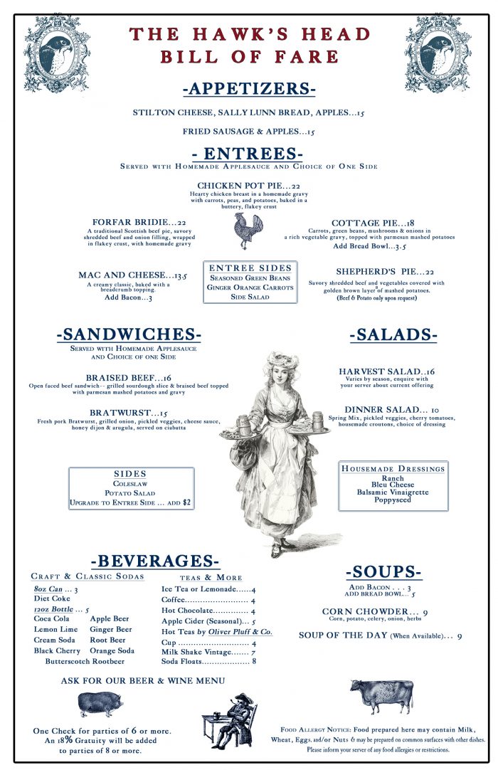 We offer a menu inspired by the comforts of early colonial America and a selection of ales, wines, and ciders for your enjoyment.